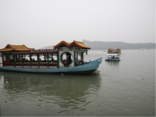Unfortunately the palace may have been very grand in it’s day, it was smoggy, and the areas of the palace that were fortunate enough to hold a few relics, we could only view them through dirty windows. There were a lot of tourists and locals walking about, but lily our guide explained that in high season they can get up to 100,ooo people per day which seems to be a huge amount of people. Inside the garden there is an outside corridor which has a claim to fame that there are about 10,000 individual paintings, but it was not my cup of tea really. We declined the climb up to the main temple to see the view and see the fragrant garden as it is a big climb and the visibility was shocking. We had an unusual afternoon tea of dumplings of the sweet variety which I found a little bland. They were filled with black bean, honey, and some bean paste. Not as tasty as our cakes at home. Instead of paying for the climb to the temple she did some wheeling and dealing and put us on a dragon boat to cross the artificial lake that incidentally took 15 years to complete, to a small island, where we crossed a bridge to get to the exit. We had a funny foot massage around the corner from the hotel we went up some very steep stairs to a room with 4 couches where 4 people did reflexology for one hour on our feet.