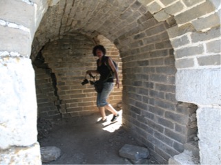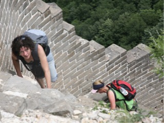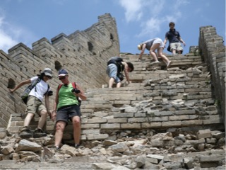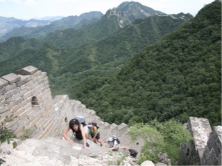 Well we have all been looking forward to seeing the great wall of china today. The wall was built over 14000 years, over 7200 kms commenced in the 7 th century. From my observation it seemed to be built from mud brick, rocks, and shale. A capping along the top of most sections, a lot of the mortar non exsistant and crumbly. There are many towers along the wall and they were all manned by Chinese personnel to keep out invaders such as chingis khan. There is a popular section of wall that has been rebuilt for tourists, but Lisa had been doing some research and found a small company that takes groups to a more remote part of the wall. We were picked up at 8 am and driven to the north east of the city and then up into the mountains. We went through some beautiful lush areas of forest covered mountains, not tall timber but smaller varieties of trees which the guide couldn’t really help us identify. As we climbed higher into the mountains the road was fairly good 2 lanes most of the way as we passed by many hotel/ resort style accommodation, fruit stalls, running water, corn and grape crops, stone fruit and hazelnut trees. We arrived in a car park and could see the wall quite high above us. We had to walk up an extremely steep track through the bush, and it was about 30 degrees with humidity. I was already struggling to keep up after about 40 m or so but took it easy and gradually made it to the top ( about 1000 m) in about 30 mins. When we reached the wall it was a scramble up a 20 feet rock face using both hands. We could see from there some fantastic views of the wall in both directions, and our guides had chosen a section of the wall which had some shady paths along the way. About 10 mins into the hike we had to climb across a sheer cliff face for about 12 feet which was a little unnerving but ok. Off we went again, some uphill some downhill, some through some small tunnels all steepish and coming across a couple of towers in the wall. We stopped for lunch after a couple of hours in the shade shush was a nice break from the heat and sun. The next ridiculous bit was insane. In front of us it looked like a sheer unsurpassable wall of about 25 meters high. When we approached however we could see that it actually had sheer steep steps. We were all a bit disconcerted at first but Reece started up, and I followed. I went up 3 steps and couldn’t believe what we were about to do. The steps were anywhere from 4 to 6 inches deep, and 1 foot to 2 foot high. Anyway that made for a very interesting climb, and one just as steep but more crumbly on the other side. The full hike was for 4 hours, but after about 3 and half hours Reece and I had really seen enough and started the descent while the others went the last 500m or so.