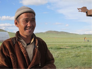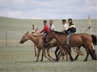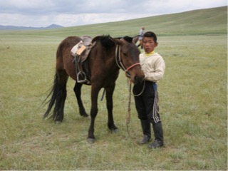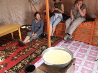 The older gentleman aged 80 years then had us as guests in his ger. He made us comfortable and offered us biscuits and sweets and went to make us some tea. In the middle of his ger stood a huge bowl of milk. It was yesterday’s milk which had been boiled and the clotted cream removed and then left to sit. It is used firstly as milk, secondly as curd, and then it is sometimes strained through a cloth, the solid kept for the winter and eaten for calcium and nutrition, the liquid fermented into an alcoholic drink. he returned with our tea which was basically warmed watered down salty milk – yum- nothing quite like I had before, nevertheless we were feeling very blessed to be there as his guest. AHis 7 yo grandson came in to meet us, at first nervous but then happy to have photos taken. Lisa had some sweets to give, and we all gave a little donation to the old man, I gave them some small toys to the jockeys plus a frisbee which was a real hit. They played with it straight away and even a guy on horseback joined in. I was informed later something like that would usually only be available on the black market. we walked back to the camp and had a chance to find some of the herb varieties in the grasses, with our guide Ogi chatting to us about past and present customs the whole time. She is one of the bestnguides I have encountered in most of my travel experience.