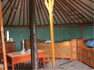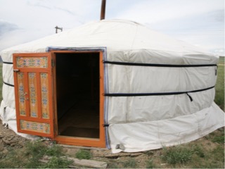 We unpacked into our fabulous ger tents, and enjoyed a bottle of wine chatting to another guest from England, Susan. One of the staff brought us hot water for tea making. We were expected in the dining room at 7pm sharp for dinner and were served mutton which had been cooked in a waterproof vessel first with some water, then some red hot stones, then meat, then stones,meat and so on and a tight lid goes on for 2 hours or so over light coals. I did not think i would like it particularly as they use 4 or 5 y/o sheep, but the grassy pastires are mild herbs mainly including thyme and sage which gives the meat quite a mild flavour we also ate potato, turnip, carrot, coleslaw and rice. Hot tea was plentiful, and we even got a nice slice of lemon cake. After the meal was placed on our table to share, we were offered one of the hot stones from the meat cooking pot each to hold as a tradition to promote wellness we went for a short walk away from the camp. Quite a few mixed species of grasses, some green, some blue, and lots of small flower bearing plants like forget me nots, and othe tiny white and yellow and mauve ones Looking from the door of the restaurant or out ger, the light wind on the grasses looks quite pretty. They dont cultivate this so the word crop not generally used, they refer to the steppes as the pasture lands. It is in a lovely setting in a large valley with hills and distant mountains. There are 20 Gers here. When I returned to my ger a young man was waiting to light a fire inside to warm it for the evening, and I believe he will return here in the morning to do the same. I gave him a tip and he came rushing back with hot water for me. It is actually hot in here now as the tent heats quickly. They are canvas on the outside, a thick layer of felt made from sheeps wool, and a lining of patterned material We arrived at around 4 pm, it is now around 10 pm, and the boys on the horses are still practicing, galloping around and around with a motor bike chasing them. The boys chant while warming up the horses to excite them. Each boy has 4 horses to excercise The horses are very sure footed but must also be exhausted. Every half hour or so we hear the sound of hooves as they go tearing past the camp. Whips waving and jockeys hollering. Hopefully I will be able to get some footage tomorrow. Our beds are hard, and the pillow is tiny made from rice husks as were the ones on the train. These ones are only about one inch thick. Babies pillows here are made from used dried tea leaves. Getting into bed a light rain is now patting on the roof of the ger, and it is warm and cosy inside. What a great day we have had!