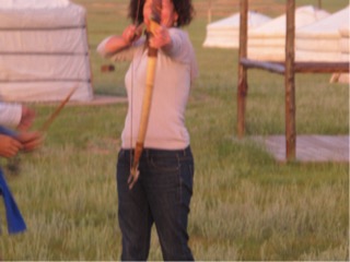 At this site is the incredible 30 m high stainless steel statue of chingis on his horse. It is an incredible engineering feat, and I am glad I am here to see it, as I don’t think the mongolians actually know how to manage looking after such a structure. The lift was broken down but we quickly climbed the stairs to take in the fantastic view over the steppes and mountains with cow and sheep herds, horses and ger camps. We had fun dressing up in some costumes of the day and bought some souvenirs. We backtracked a few kms and went down a rough dirt track to our camp, the elstei ger camp. Our arrival was very exciting. The driver announced our arrival by beeping the horn a few times, and about 10 staff rushed out to greet us and carry our bags into camp from the carpark about 150 m At the same time about 6 horses training for the nadaan festival rode through the camp outskirts whooping like Indians, galloping like crazy, and one young boy wielding a rope and swinging round and round.