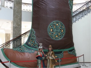 This morning we have to pack and head on back to town. Our fire was lit at 7 am and hot water was bought for us to make tea. Breakfast is always served at 9 am so plenty of time for a last look around and to pack. Breakfast today was warm milk and honey, and similar to yesterday. On the drive back to Ulsan bataar over the terrible road, the driver had to weave in and out of the huge holes in the road. We stopped and took our photo with a huge eagle similar to a wedge tail, it was from kazmenikstan. Once in town we visited a few shops, post office and cashmere showroom. When we went to cheek. Into our hotel it was fully booked and we were transferred to ” tower b” as an upgrade. When I walked into our room it was already occupied so we had an upgrade to the presidential suite, which was huge. A small bar/ kitchen, a dining room, a living room plus writing desk, a large bathroom with gold rimmed china, and lots of storage. We attended a one hour concert at the national folk theatre. I love any type of concert and i found this one to be extremely good. Unfortunately like russia traces of communism are obvious, and the entry point to the theatre was a disgrace. Poor signage, unkempt road and parking place, we walked there and had to hop around huge puddles of water. We saw dancing of a few types, femLe and male singers, an amazing throat singer, and a gorgeous female contortionist who was incredible.