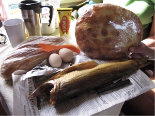 Slept fairly well on the reasonably smooth overnight train. We are scheduled to arrive in Ekaterinburg around 6pm. We woke around 6 am to a lovely sunny day, possibly cold outside, our train is air-conditioned. It had been raining during the night. Today we are passing through larger and a bit more affluent towns, even though most of these still have gravel roads and old wooden houses. Most industrial things seem to be old as well ie:buildings and silos. On the fringes of the train track most houses have very big vegetable gardens and wood heaps. Have seen some reasonably modern roads and bridges, piles of scoria on the sides of the track, large silos, crop fields, but most of all silver birch and more silver birch. Fir trees of different variety increasing as we advance We are also passing/ meeting other trains, mainly freight around every half hour or so. railway is very important for all the rural industries here, especially the minerals and precious stones, ie: rodanite, topaz, quartz, amethyst, from the Ural mountains. Vodka man from last night wearing a bit of blood and bandaids this morning and the waiter in the catering car is asleep on a seat in there. we caught Rema going in to vodka mans compartment and never saw her come out u til we got off the train with him..During this morning we had a stop for about 20 mins and were able to get off and buy food from locals on the platform. We consequently had loaves and fishes for lunch. We shared 2 eggs, a salted smoked trout, 2 loaves of bread and some cheese.