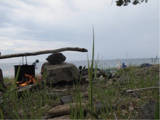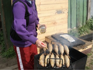 This morning we go a sleep in as our private guide didn’t need us until 1030. We walked about 800 m to the local ferry and went to the other side of the lake, at this point only about 3km wide I would think as it only took 15 min. The lake is incredibly clear with 40 m visibility, and in the winter when it first freezes over you can clearly see into the depths of the lake. Once off the ferry we walked around the lakes edge along an old railway line at a quick walk for one hour. Sacha our guide built a little fire over which he grilled us some of the local fish and served it with bread, tomato, cucumber, cheese, and 2 bottles of Russian wine which was all really nice. We sat on a clearing full of wildflowers with butterflies of about 5 different types flying around us. There were horse flies also but he had some good repellant for that. It was a very pleasant few hours spent there. On the walk home about one third of the way we went to a rocky beach. Dacha built a small fire and boiled a large Billy of water from the lake and we had cups of Billy tea with buns and chocolate. While waiting for the water to boil we all tried getting into the lake with our trousers rolled up. It was so cold Jane said her legs feet were aching but everyone elses just felt numb. We caught the ferry back and got a taxi into town.
