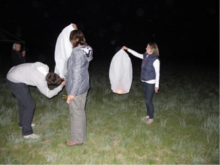 We had a lovely ride through the valley past the sheep, cattle, and herd of horses. It was perfect and calm weather and we all enjoyed it immensely. We saw a pair of mandarin ducks which were a lovely co our but were not allowed to use the cameras while on horseback. Our horsemen were very obliging with photo shoots at the end which was great as they wore interesting gear. They rode on very uncomfortable but decorated wooden saddles. Dinner was ready so we had to go straight to the dining room for salad, and a fresh pasta and beef dish. After dinner Ogi, ourselves, Susan, Mel duffield, and mike Oman all played a hilarious card game called spoons. Jane made a big dive under the glass table at one point and went sliding along under our feet. It was hilarious. On the way to bed Mel and mike from london lit some Chinese paper floating lantens which floated off into the night sky. Back in our cabins our fire had warmed we got to bed late again, around 1230. What an eventful and fun day.
