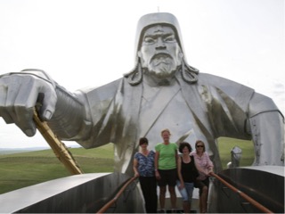 The early morning sun on the hills and steppes is picturesque as we pass by many Gers, villages and camps. We also passed by an area that was occupiednby the Russians during the war, quite a few bunkers covered in grass so as not to be seen from above plus some other larger brick buildings close by. It is all very green but the grass is short. Quite a few small cow herds, and occasional horses. Grasses look sparse and sprinkled with small wildflowers. Many of the farmers are out and about. We arrived at Ulan bataar the largest city in Mongolia. Mongolia has roughly a population of 2.5 million of which 1.2 million live in the city. In the summer however most city dwellers move from their apartments to summer camps and houses into the hills where it is cooler. We were taken to a japanese bath house in a hotel for a shower and breakfast. The city is dusty with busy traffic and some poor maintenance on the infrastructure. Hazards on footpaths, unfinished projects, and road rage which is ridiculous when the traffic is so much worse elsewhere. The city has a huge central square ( easily twice the size of the fed square area, next to the parliament house, and is also surrounded by ballet theatre, art gallery, museum, and a dinosaur museum. We had a city walking tour then ate lunch at a traditional Mongolian BBQ buffet which was passable. We were then pleasantly surprised to learn that our guide ogi was going to spend the next couple of days with us in the ger camp. She has very fluent English plus other languages. We were driven 70 kms east of Ulan bataar to the site where chinges khan was supposed to have found a whip at the age of 15yo and went on to be the fearless leader and ruler of old Mongolia until the age of about 65 when he was still leading his men into battle ( died around 1228 I think.).