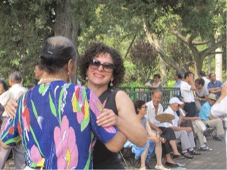 Today Jane Lisa and I went to the temple of heaven garden. Reece wasn’t particularly interested, as the visit to summer palace was a bit disappointing for all of us with the crowds, visibility and poorly displayed articles, hawkers etc. She decided to check out the shopping and other stuff. We grabbed a taxi and were very pleased with the beautiful 280 hectare garden, with many many groups of locals enjoying the garden. We saw outdoor groups of ballroom dancing, families playing hacky sack, Kung Fu competition, elderly men extremely fit on parallel bars, tai chi, knitting, board games, singing, dancing, yo ho diablo, kite flying, and graceful balls on rackets with a group exercising with them. A weird guy asked jane for a dance to the amusement if others, pulling faces and dressed quite strangely, and at the end he gave us his business card which said he was a famius comic star or something. We had a lovely walk through the garden which had a variety of neatly set out fir tree forest,rose gardens, and nice grasses for people to picnic.